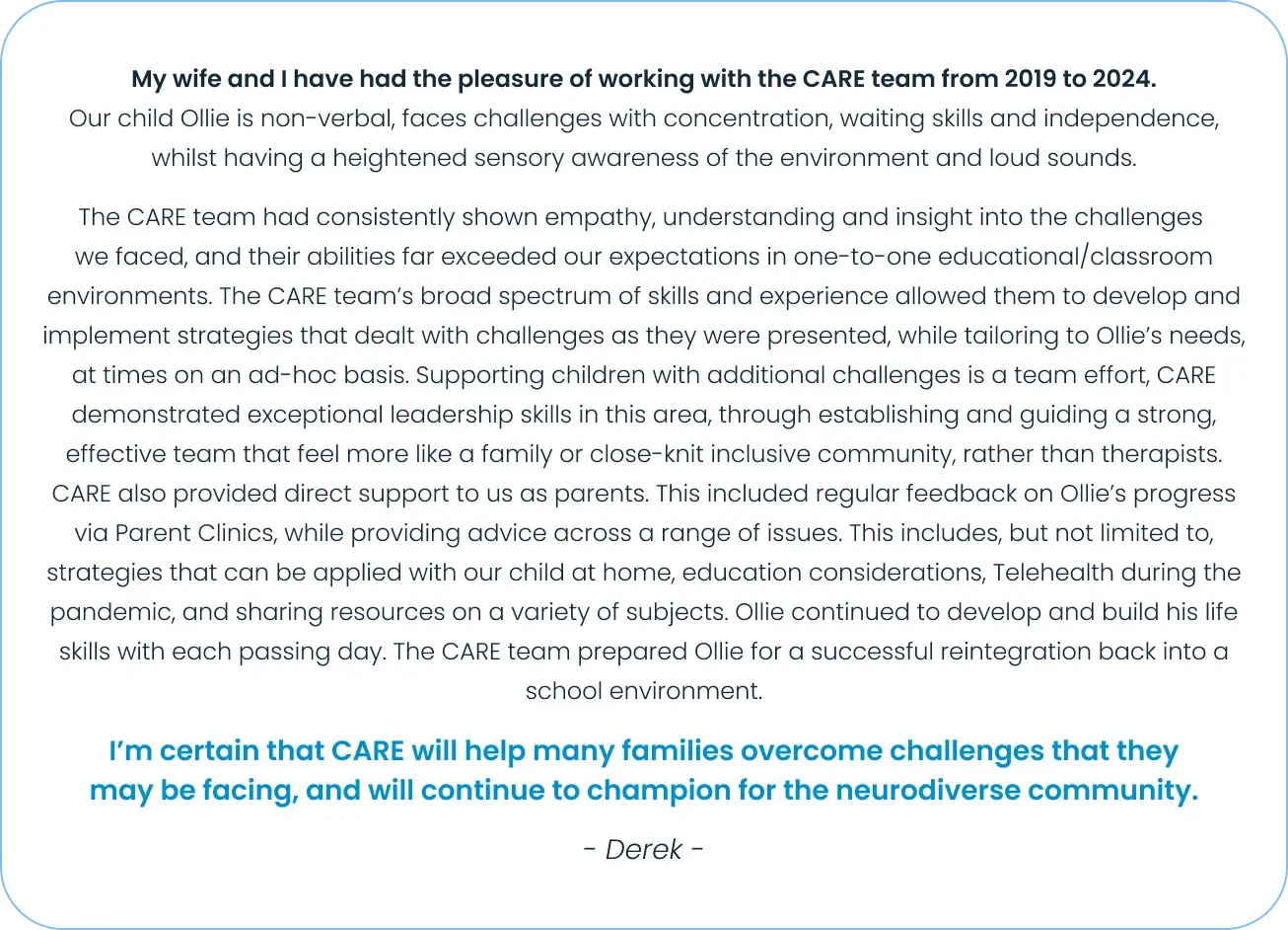CARE was founded by a group of parents who shared a mission: to create a place where neurodivergent learners could be understood, supported, and empowered. What started as a shared hope has grown into a dedicated space where we help learners build essential skills and live more independent and meaningful lives.